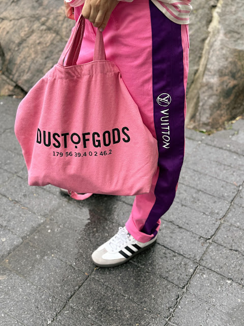 Sam- Dust of Gods Raptors hat and pink bag, Zara Barbie top, Louis Vuitton pants, Adidas Sambas